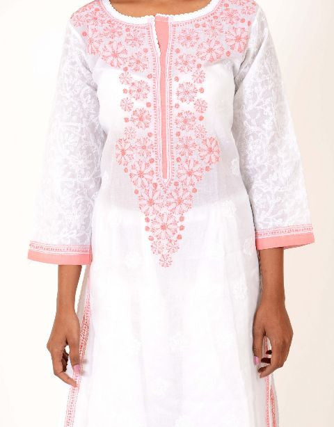 White Chikankari Kurta with Pink Highlights